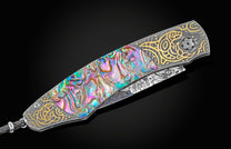 The Spearpoint ‘Ketchikan’ features a hand-forged 'Twist' damascus frame by Chad Nichols, hand-engraved with 18k green gold by Tyler Prince, and inlaid with abalone shell. The blade is hand-forged 'Mosaic' damascus by Luke Mattern; the one-hand button lock and thumb stud are set with sapphires. A remarkable design that gives you an instrument with a full-size secure grip, and a versatile deep-belly blade, the Spearpoint epitomizes William Henry’s core philosophy – that superlative function deserves to be elevated to superlative art. The 'Ketchikan' features some of the most exotic materials, artistry and forged metals that are the hallmark of William Henry's collections; a timeless heirloom to be proudly worn and used for a lifetime before being handed-down to another generation.