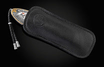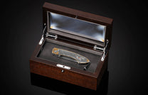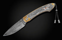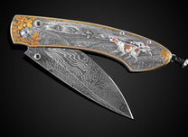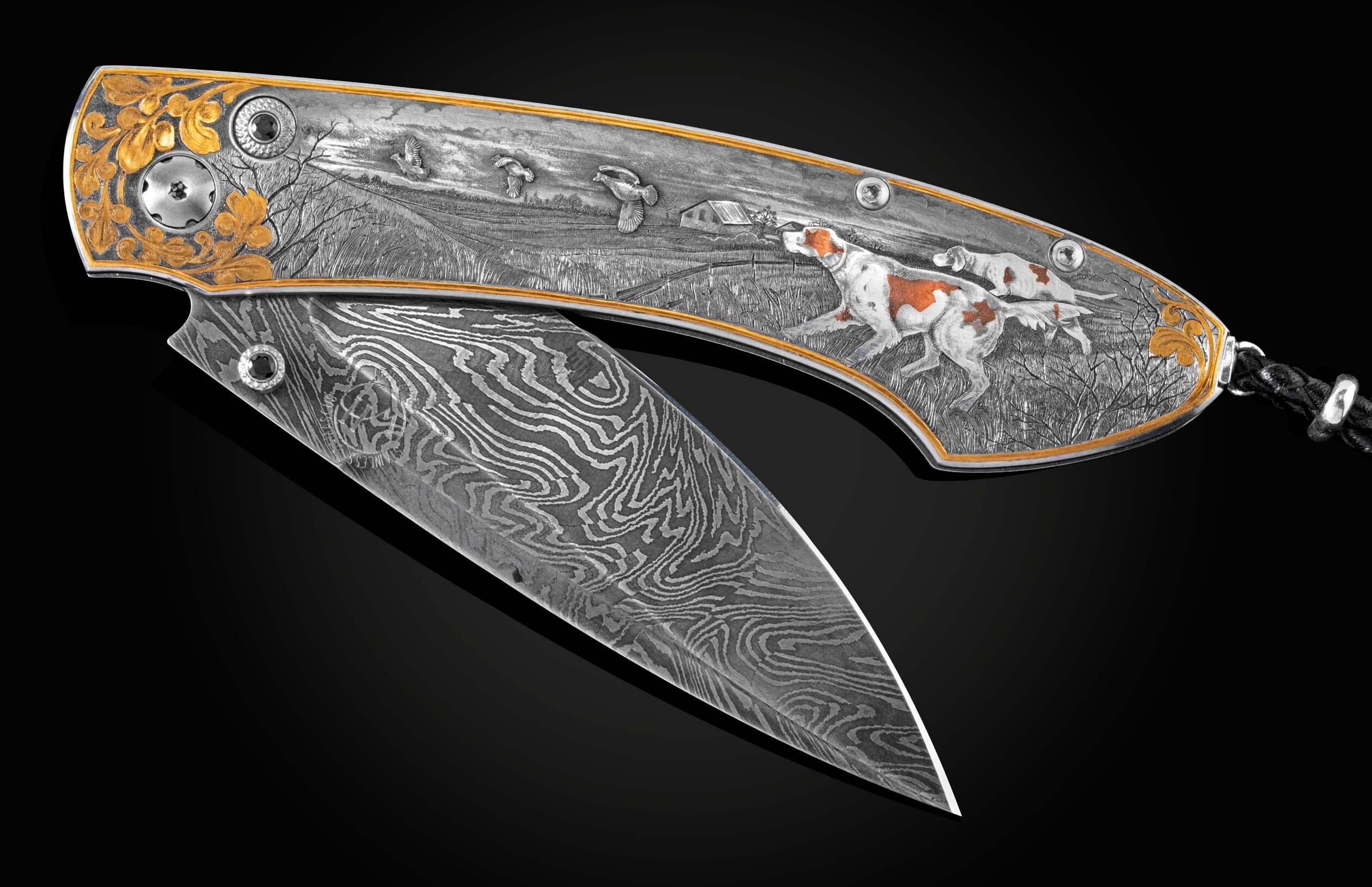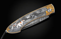 The Spearpoint ‘Bird Hunt’ features a hand-engraved stainless steel frame inlaid with 24K gold, silver, copper, and sculpted damascus from vintage shotgun barrels by Vincent Crowley. The blade is hand-forged damascus by Zoe Crist; the one-hand button lock and the thumb stud are set with spinel gemstones. A remarkable instrument with a full-size secure grip and versatile deep-belly blade, the Spearpoint epitomizes William Henry’s core philosophy – that superlative function deserves to be elevated to superlative art. The 'Bird Hunt' features hand-forged metals and hours of microscopic hand-engraving which are the hallmark of William Henry's most exclusive creations; a timeless heirloom to be proudly worn and used for a lifetime before being handed-down to another generation.